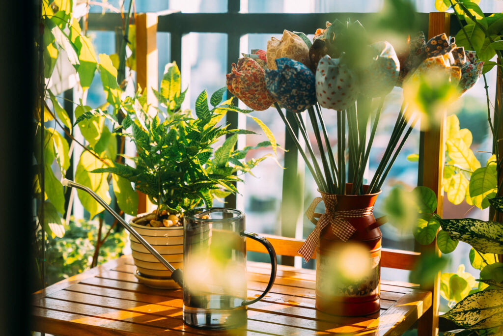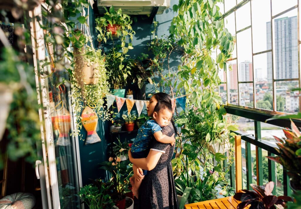 Chiếc ban công đơn sơ bắt đầu được cải tạo. Ban đầu là đưa hết cục nóng điều hòa lên trên. Rồi sơn lại tường, làm thêm khung sắt. Những chậu cây đầu tiên, những giàn leo đầu tiên, những bông hoa đầu tiên,…